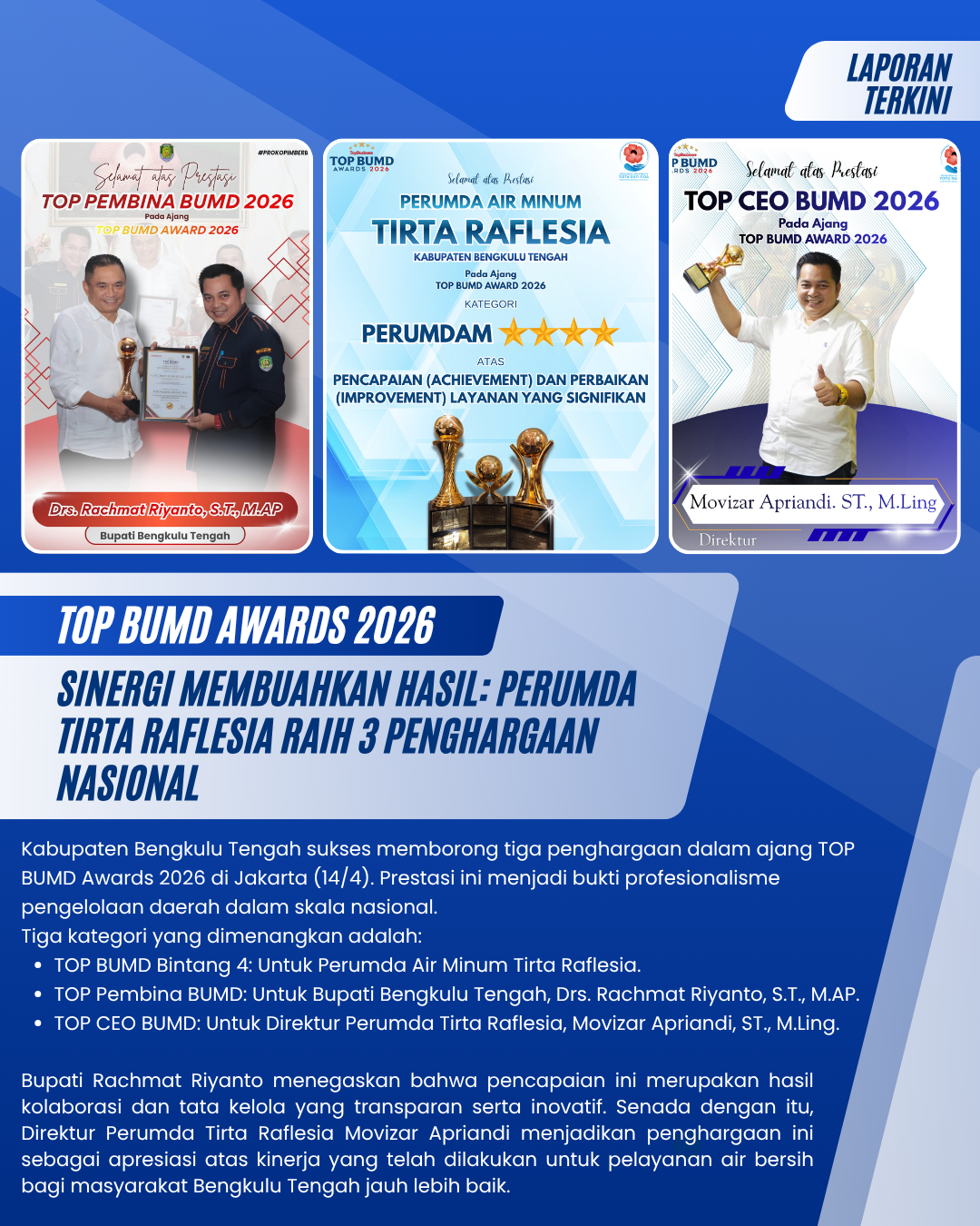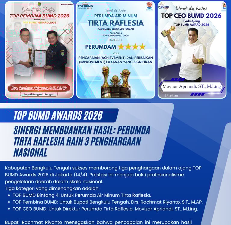 Prestasi gemilang kembali ditorehkan oleh Badan Usaha Milik Daerah (BUMD) Kabupaten Bengkulu Tengah. Dalam ajang penghargaan TOP BUMD Awards 2026, PERUMDA AIR MINUM Tirta Raflesia berhasil mengukuhkan posisinya sebagai salah satu perusahaan daerah terbaik di Indonesia dengan menyabet tiga kategori penghargaan sekaligus.
